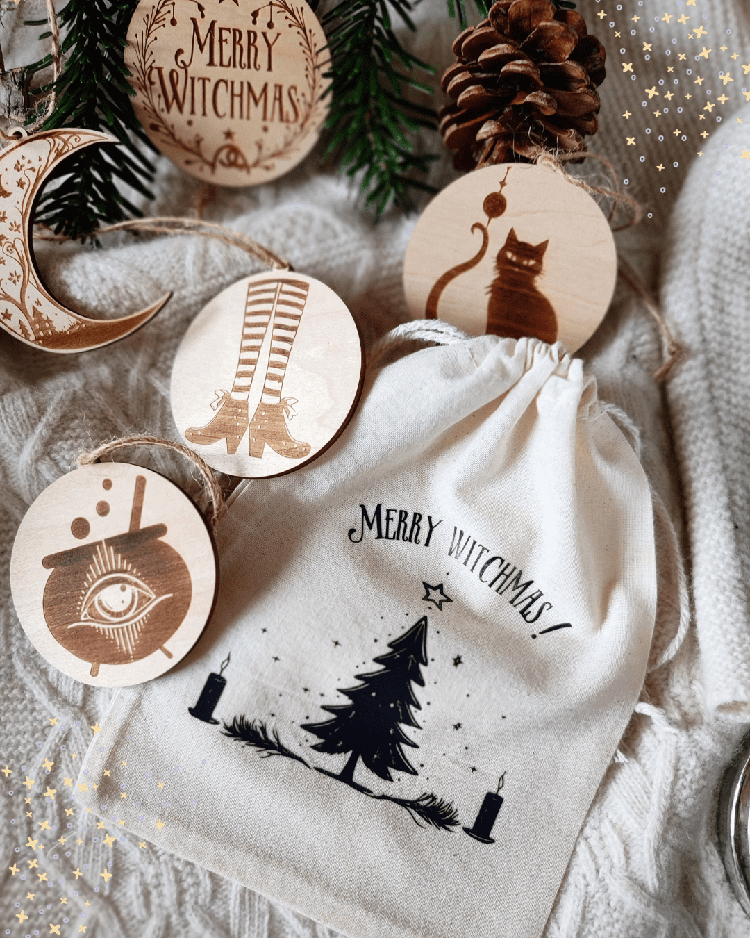 7 boules de Noël des sorcières: en bois gravées et livrées dans un joli pochon en tissu. Chaque motif possède sa propre énergie et intention magique: Croissant de lune, pentacle, bottines de sorcières, chapeau de sorcière, chaudron, chat noir, inscription “Merry Witchmas”. https://lespetitschaudrons.fr/produit/boules-de-noel-des-sorcieres/